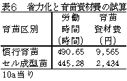 6)省力化の試算 セル成型苗を利用すると、10a当たりの労働時間が約445時間となり、慣行育苗に比べ約10%の省力化が可能となった(表6)。