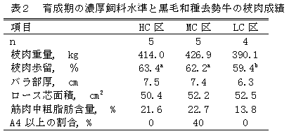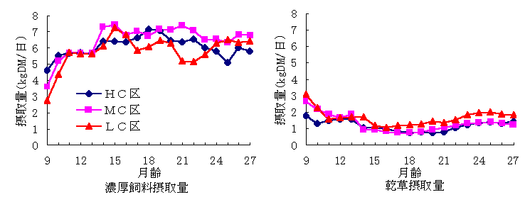 (2)LC区の濃厚飼料摂取量は15か月齢をピークに、その後減少した。HC区も18か月齢をピークに、その後減少した。乾草の摂取量は15か月齢以降LC区が高く推移した。(図1)。枝肉成績を表3に示した。枝肉重量はMC区が最も大きく、LC区が最も小さかった。しかし統計的に有意ではなかった。枝肉歩留はLC区が有意に(P<0.01)低い値を示した。皮下脂肪厚はHC区が厚くなる傾向を示し、バラ部厚はLC区で薄くなる傾向が見られた。ロース芯面積には差が認められなかった。胸最長筋中の粗脂肪含量はLC区で約10ポイント低い値を示した。A-4以上の上物率は、MC区が40%であったのに対してHC区とLC区では0%であった。以上の結果から、MC区レベルの濃厚飼料水準、すなわち約50gDM/MBSで育成した牛は、肥育期間における飼料摂取量の低下が少なく発育も良好であり、産肉性にも優れるものと考えられた。