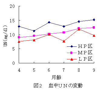 試験2:発育および飼料摂取量を表3に示した。平均離乳日齢は約95日齢で離乳体重は約100kgであった。終了体重はHP区が283.1kg、MP区が273.8kg、LP区が273.2kgであり、試験期間中の平均日増体量はHP区で大きくなる傾向にあった。試験期間中における体高の発育は、MP区およびLP区と比較してHP区で高くなる傾向にあった。濃厚飼料の摂取量は設定通り50gDM/MBSであった。濃厚飼料のCP含量が高まるにつれて乾草の摂取量は増加する傾向を示した。血中UNはいずれも20mg/dlを下回っており(図2)、窒素の過剰摂取はないと見なされた。したがって、濃厚飼料のCP含量を25%まで高めることは、去勢育成牛の乾物摂取量を向上させ、増体を高める効果があると考えられた。