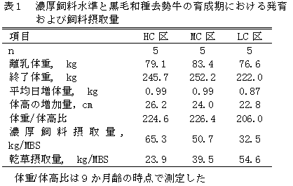試験1:(1)育成終了時の体重は、HC区が245.7kg、MC区が252.2kg、LC区が222.0kgであった。試験期間中の平均日増体量および体高の発育は、LC区で低くなる傾向にあった。育成終了時の体重/体高比は、LC区で他の2区と比較して約10%低くなった。濃厚飼料摂取量は、HC区が65.3gDM/MBS、MC区が50.7gDM/MBS、LC区が32.5gDM/MBSであった。乾草の摂取量はHC区からLC区へと高まる傾向にあった。