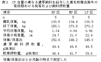 3か月齢で離乳した黒毛和種去勢牛15頭を用い、濃厚飼料の設定CP含量で25%(HP区)・20%(MP区)・15%(LP区)の3水準設けて試験を行った。濃厚飼料の給与量は代謝体重(MBS)あたり50gDMとし、乾草は自由採食させた。