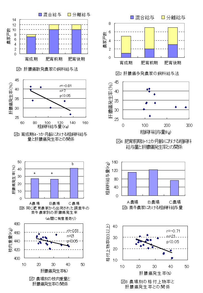 1)〜4)の結果から、乳用雄肥育牛における肝膿瘍の発生要因として、育成期での粗飼料採食量の不足が考えられ、発生低減のために育成期には嗜好性の良い粗飼料を準備し、かつこれらを適切に採食させる混合給与方式をとることが重要と考えられた。