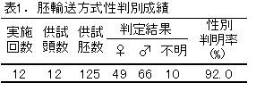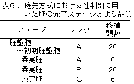 1)低品質胚および若齢胚の性判別後の受胎率は低いので、良質で適切な発育ステージの胚の利用を基本とする。