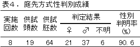 (3)胚回収頭数は19頭、性判別に供試した胚数は64個で、性別判明率は90.6%であった。移 植頭数は29頭で、受胎率は20.7%(6/29)であり、分娩に至った産子6頭の性別は判定結果 と全て一致していた。(表4および表5)。
