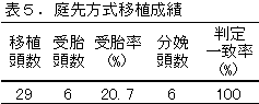 (4)採取した胚は桑実胚が約60%と若い胚が多く、また、胚のランクはBおよびCランクが 50%を占めていた。このことが低受胎率の原因のひとつと考えられた(表6)。