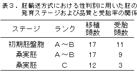 (2)胚の発育ステージおよびランクによって受胎率は大きく影響を受けた(表3)。