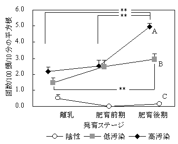 図 1 病原浸潤と発育ステージによる咳回数の変化