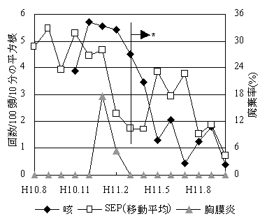 (2) 豚マイコプラズマ肺炎(MPS)不活化ワクチンの接種を開始した2農場で、咳回数を定期的に計測したところ、その減少が観察された。特に肥育後期の咳回数の減少は、と畜場におけるSEP(MPS様肺病変に相当)による肺の廃棄率の減少と一致し、同ワクチンの効果を判定できると考えられた(図2)。またこのうちの1農場では、咳回数が一定値までしか減少せず、次に対策を検討すべき疾病の存在を示唆できた。