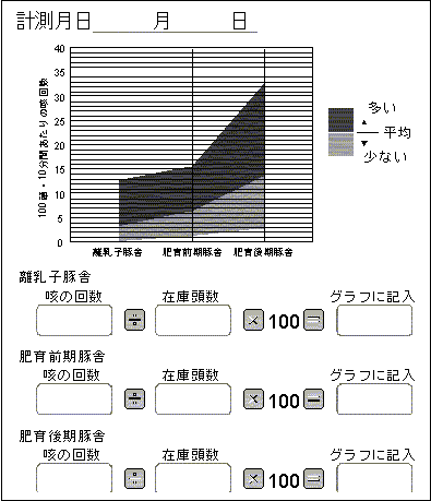 - 以上のことから、咳・くしゃみ回数の計測は、豚の呼吸器感染症のモニタリング手法として有効であることが明らかとなった。そこで、生産現場での利用を考慮したチェックシートを咳・くしゃみそれぞれについて試作した(図3)。