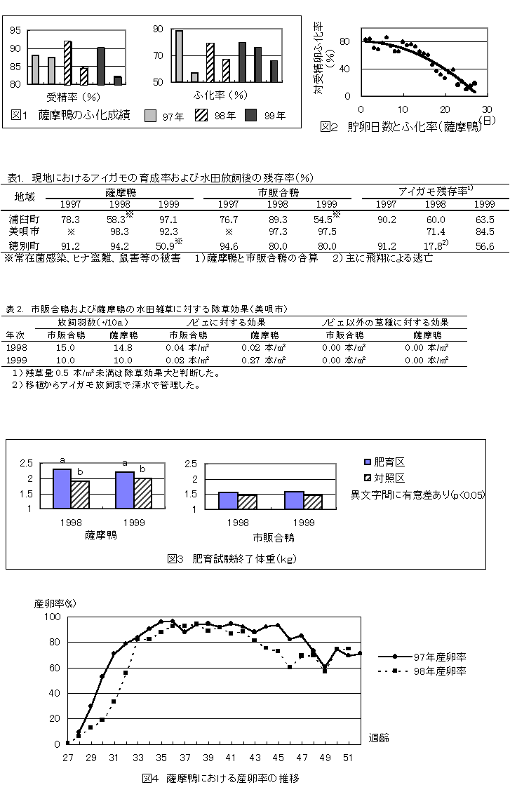 水田放飼用アイガモのふ化および育すう技術、水田雑草に対する除草効果、水田放飼中のアイガモの損耗、水田引き上げ後の肥育技術ならびに種禽の産卵性について検討する。