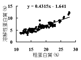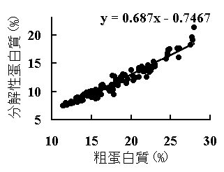 3)アルファルファの蛋白質含量と分解性・溶解性蛋白質には正比例の関係があり,粗蛋白質含量に占める分解性・溶解性蛋白貫の比率はそれぞれ68.7%と43.2%であった(図2)。