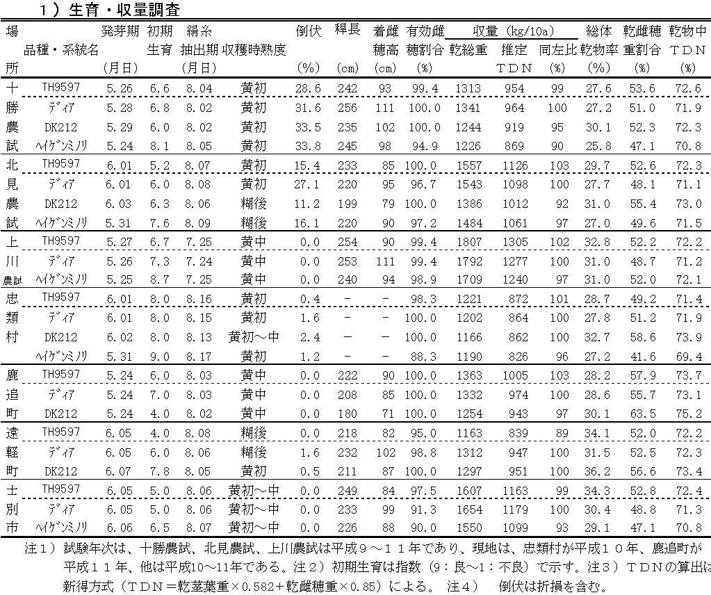 課題の分類 新品種候補名 とうもろこし(サイレージ用)「TH9597」 試験場所名 北海道立十勝,北見,上川農試,農林水産省北海道農試 |