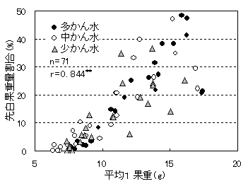 ② 平均1果重と先白果発生割合の間に正の相関が見られた(図-1)。