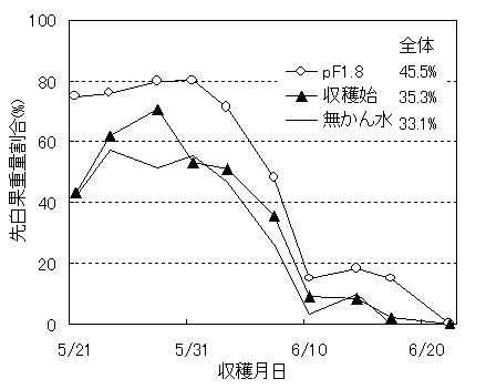 ① 収穫始以前のかん水は先白果発生を助長させるが、収穫始以降のかん水は先白果発生をほとんど助長しなかった(図-2)。