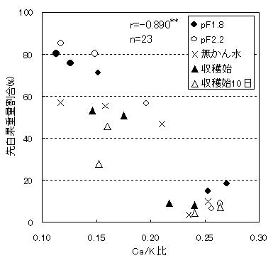 ③ Ca/K比と先白果重量割合の相関係数は、-0.890であり強い負の相関が認められた