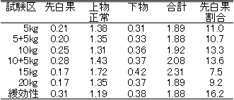 ② 収量は15kg区で最も多く、20kg区では15kg区と比べて収量が減少した(表-1)。