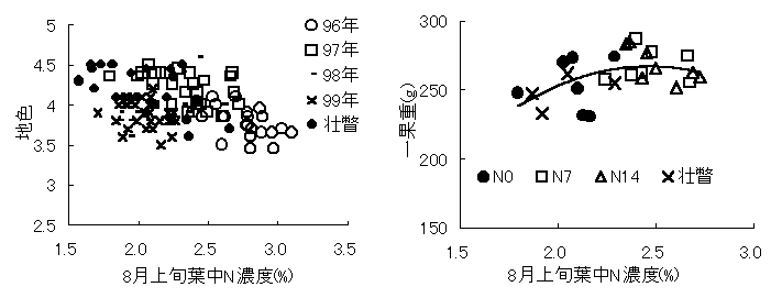 (1)果実の地色は8月上旬の葉中窒素濃度が概ね2.5%以上で悪化し、着色も窒素濃度の上昇に伴い低下した。一果重は8月上旬の葉中窒素濃度が概ね2.0%以下で有意に低下した(図1)。