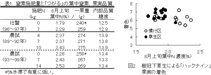 現地果樹園:壮瞥町生産農家、’88年定植、窒素用量試験(窒素0、7kg/10a)、全面草生栽培。