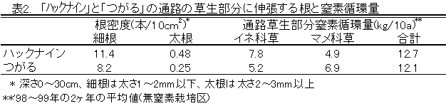 (3)このことは「ハックナイン」は、①樹冠下より通路に伸張する根数密度が「つがる」より多く、太根数が「つがる」の約2倍も存在する、②通路部分の草生の窒素循環量は10〜14kg/10aである、ことが要因で循環する窒素を「つがる」より有効に吸収利用できるためと推定した(表2)。