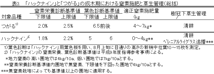 4) 以上を総合して、「ハックナイン」と「つがる」の成木期における窒素施肥と草生管理をまとめた(表3)。