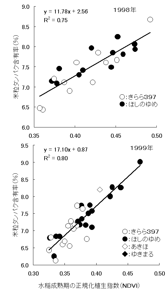 2)大規模水田が広く分布する夕張郡長沼町において1998年・1999年に、水稲成熟期に衛星観測を行い、現地の調査圃場(1998年24圃場・1999年33圃場)で実測した米粒タンパク含有率との関係を検討したところ、石狩川下流域で得られた傾向と同様に、水稲成熟期のNDVIと米粒タンパク含有率との間には正の相関があり、衛星データを用いて個々の圃場の米粒タンパク含有率の推定が可能であった(図1)。