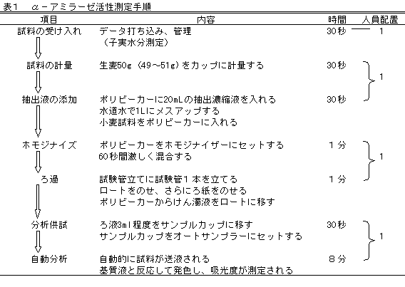 α−アミラーゼ活性自動分析装置により、1点当たり前処理も含めて約12分で活性測定が可能であった(表1)。また、1時間当たりの処理能力は37点であった。ホモジナイザーを用いることにより、生麦および乾麦から1分間で効率的にα−アミラーゼ活性が抽出可能であった。また、抽出稀釈液に水道水の使用が可能と推測されるが、実際の使用に当たっては酵素活性に及ぼす影響を確認すること。