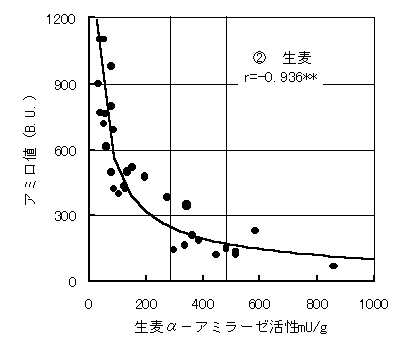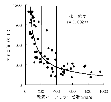 乾麦のα−アミラーゼ活性とアミロ値とは高い負の相関が認められ、乾物当たりのα−アミラーゼ活性が200mU/g以下ではほとんどがアミロ値300B.U.以上の正常小麦であり、400mU/g以上では多くが低アミロ小麦であった(図1)。生麦では、300mU/g以下ではほとんどが正常小麦であり、500mU/g以上ではすべて低アミロ小麦であった。α−アミラーゼ活性とフォーリング・ナンバーの間についてもアミロ値の場合と同様の関係が認められたことから、オートアナライザーによるα−アミラーゼ活性測定法は、新たなでん粉粘度規格であるフォーリング・ナンバーにも対応可能であることが確かめられた。
