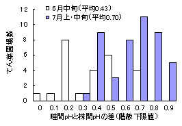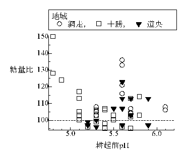 1)てんさい圃場では、株間pHは7月で下限値に達し、耕起前に比べて平均0.7低下した(図1)。耕起前pHが5.5以下の圃場では7月の株間pHがアルミニウム溶出の可能性が懸 念される水準まで低下し(図2)、生育に影響する可能性が認められた(図3)。