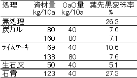 処理:無処理、防散炭カル(CaO量50%)40,50,80,100,160,240kg/10a・粒状ライムケーキ(同58%)69,138kg/10a・粒状生石灰(同80%)50,100kg/10a・粒状石膏資材(同32.5%)123kg/10a作条施用、防散炭カル240kg/10a全面施用