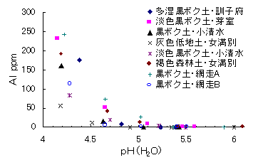 土壌溶液へのアルミニウム溶出:土壌を培養し土壌溶液を遠心法(pF4.2)で採取した。