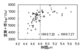 てんさい株間土壌pHの低下:網走地域のてんさい畦間・株間土壌調査(1999年6・7月)