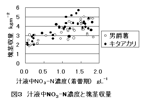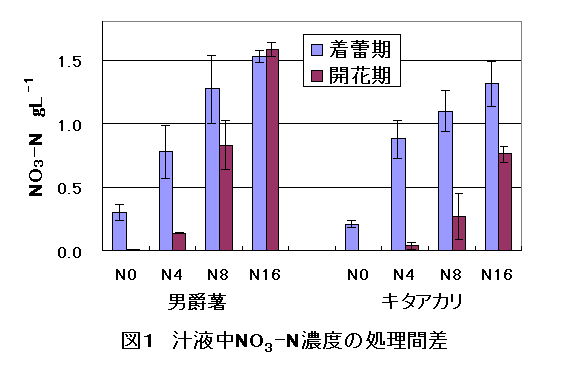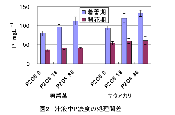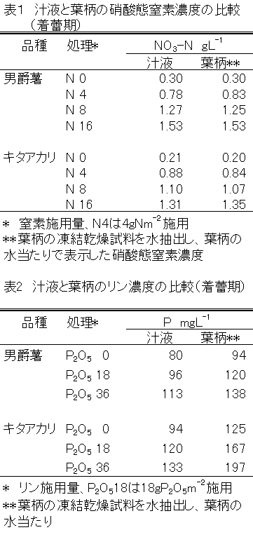 1997〜1999年に、ばれいしょ(男爵薯、キタアカリ)を、窒素施用量4段階、リン酸施用量3段階、①N0, P20518 ②N4, P20518 ③N8, P20518(標準区)④N16, P20518 ⑤N8, P2050 ⑥N8, P20536 gm−2で栽培し、主に着蕾期、開花期に汁液中硝酸態窒素、リン濃度等を測定した。