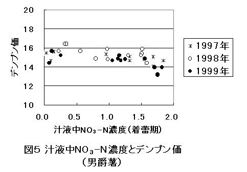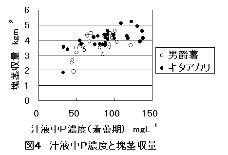 4)十分な収量を得るために、着蕾期葉柄汁液の硝酸態窒素濃度は1.3〜1.5 gL-1、リン濃度は100 mgL-1程度が望ましい(図3、4)。品質面でも、硝酸態窒素濃度1.5 gL-1以上になると男爵薯でデンプン価14以下になるものが出現する(図5)。
