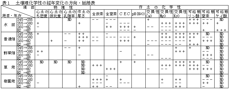 (1) 水 田:全炭素・全窒素・可給態窒素は一時期顕著に減少したが、その後全窒素・可給態窒素は増加している。カリ・苦土・リン酸は昭和60年まで著しく増加し、カリ・リン酸は依然蓄積傾向にあるが、苦土は逆に減少している。ケイ酸は近年顕著に増加し、また石灰は減少している。
