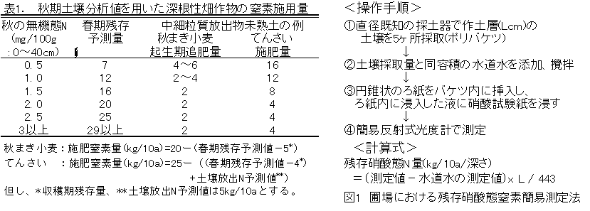 2) 残存無機態窒素の回収のため、①各種作物の窒素吸収根域を設定し、②翌春の1m土層内無機態窒素残存量の予測方法を翌春残存率及び秋期0〜40cm土層の無機態窒素含量と1m土層内の残存量の関係式から導きだし、③深根性畑作物(秋まき小麦、てんさい)の導入とその効果的窒素施肥量の目安を作成した(表1)。さらに、④露地野菜に対する適正窒素施肥量を算出のための圃場での残存硝酸態窒素の測定法を組み立てた(図1)。