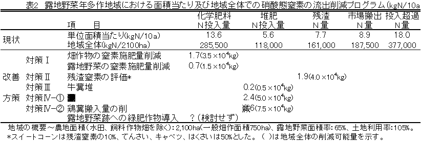 4) 露地野菜年多作地域における窒素流出量削減のための改善プログラムとして、①深根性畑作物、露地野菜の窒素施肥改善、②残渣窒素の肥料評価、③施用堆肥の窒素代替量、④堆肥投入量の削減の4項目に分け、それぞれの削減可能量を算出した(表2)。