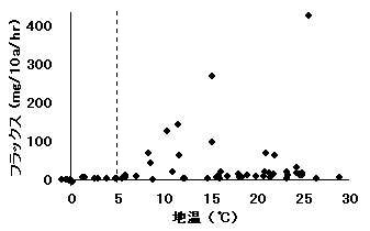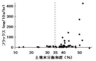 ① 定点観測におけるフラックス(N2O放出量)は、土壌水分飽和度と地温が高い観測日に大きくなる傾向が認められた(図1)。冬期間(12月〜1月)のフラックスは、ビニ−ル周年被覆時には認められたが、積雪下では認められなかった。