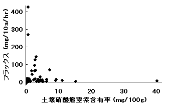 ⑥ 冬期間にビニ−ル被覆を排除したハウスでは、残存硝酸態窒素レベルに関わらず、フラックスが抑制され、定点観測の結果を裏付けた。ただし、硝酸態窒素が集積したハウスでは、冬期にビニ−ル被覆を排除すると土壌硝酸態窒素の溶脱を招くため、施設栽培においては、土壌中に硝酸態窒素を集積させない肥培管理に努める必要がある。