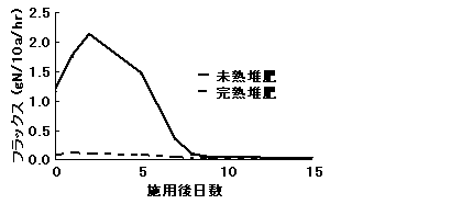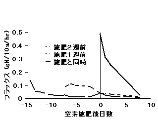 ⑤ 堆肥と窒素肥料の同時施用はフラックスを増加させたが、施肥の1週間以上前に堆肥を施用すると、フラックスは抑制された(図4)。