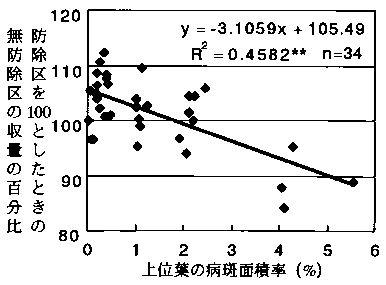 図1 開花時の発病と収量との関係