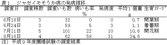 ② 平成9年度の調査では,ジャガイモそうか病の病いもは,着蕾期にあたる6月下旬に確認され,その後病いも率,発病度共に増加した(表1)。