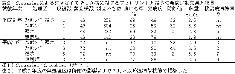 ③ Streptomyces scabiesによるジャガイモそうか病に対する発病抑制効果は,フェロサンドと灌水の併用処理およびフェロサンド単独の処理で認められたが,灌水単独の処理では認められなかった。また,フェロサンドと灌水の併用処理はフェロサンド単独の処理に比べ発病抑制効果が優っていた(表2)。