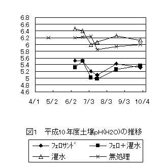 汚染圃場にフェロサンドと灌水の併用区,フェロサンド区,灌水区並びに無処理区を設けた。フェロサンドの施用量は平成8年度指導参考事項に準拠し,目標pHを5.0とした。灌水は灌水チューブを2畝に1本配置し,萌芽期から7月下旬までpF2.3を越えた時点で実施した。
