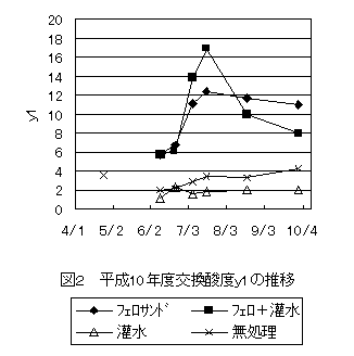 ⑤ 土壌pHを低下させ,交換酸度y1を高める処理(フェロサンドと灌水の併用処理,フェロサンド単独の処理)は,防除価が高かった(表2,図1,2)。