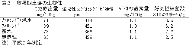 ⑥ フェロサンド処理初年目の収穫期土壌について,土壌の生物性に関する量的な差は各処理間で認められなかった(表3)。