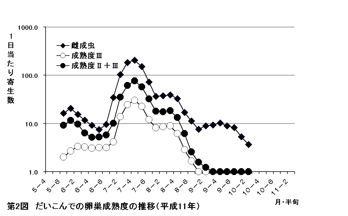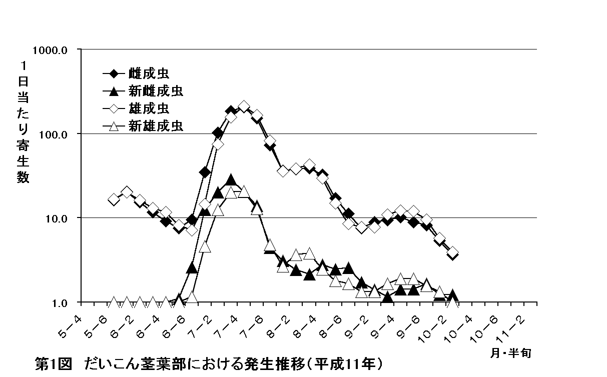 6月下旬から8月上旬に播種しただいこんの被害は高く、8月下旬に播種しただいこんの被害が最も小さかった。5月〜6月上旬に播種しただいこんでの被害は中間程度の値となった。