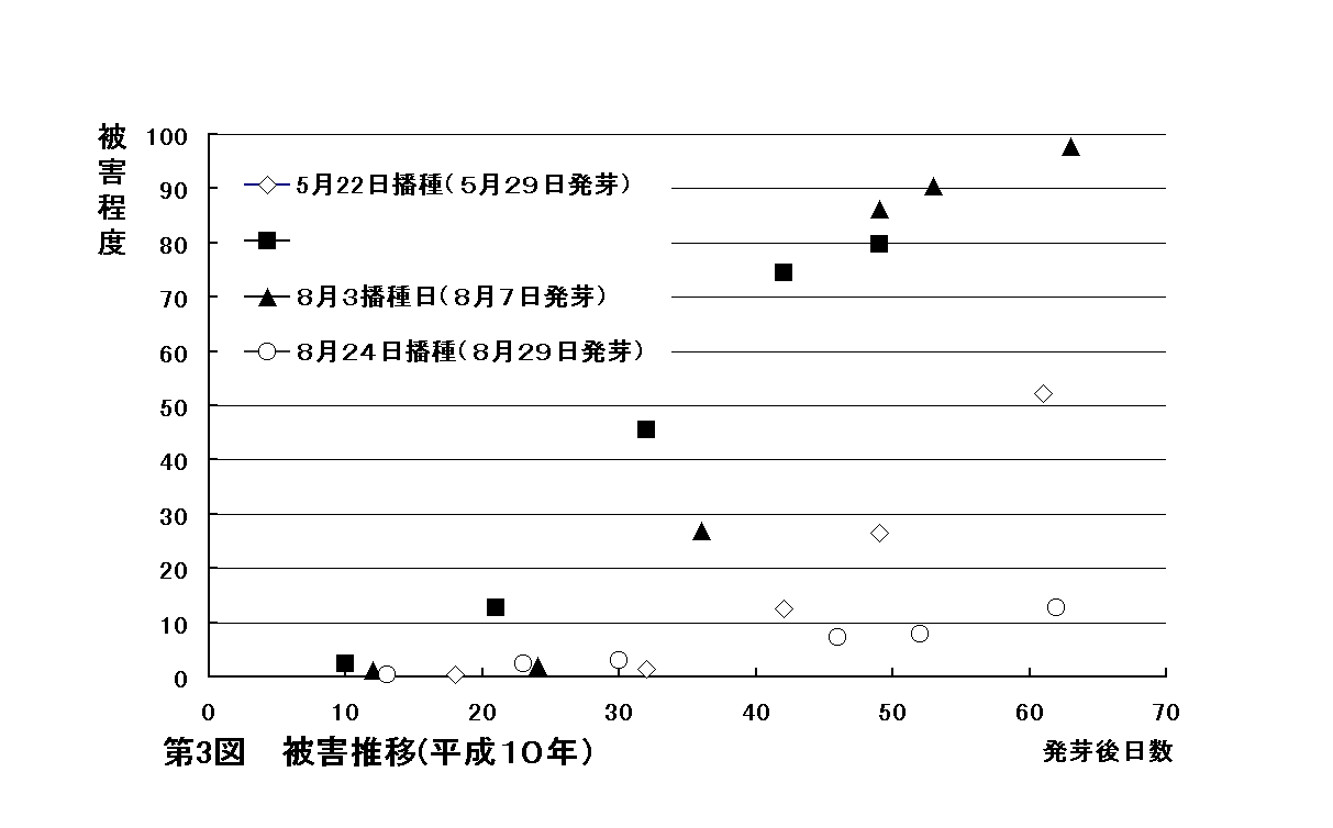 どの時期に播種しても発芽後3週間程度経たなければ被害が発生しないことから、卵期間(約1週間)を除き、発芽後約2週間以降の産卵が被害に結びつくと考えられた。
