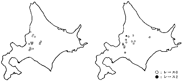 1)1993年に北海道の一部で発生を認めたメロンつる割病菌レース1,2yは、1999年現在で3支庁15市町村に分布を拡大した(図1)。レース0はほぼ全域、レース2は一部に分布する(図2)。