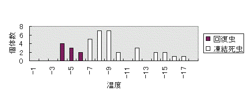 (3)成虫の過冷却点は平均-9.2℃(-4.0℃〜-17.0℃)で(図2)、幼虫では平均-15.9℃(-12.5℃〜-19.5℃)であり、積雪下の土中では成虫幼虫は凍らないで越冬が可能と考えられる。