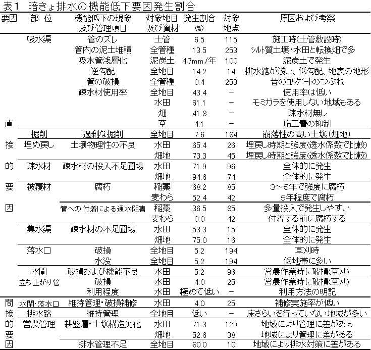 3)暗きょ排水機能低下の直接的要因は埋め戻し土の土壌構造の消失などの土壌物理性の低下や疎水材の投入量不足が起因していた。また、間接的要因としては粘土客土や土壌圧縮による耕盤層の生成により圃場の排水性が低下があげられた。さらに、暗きょの維持管理や営農による排水対策が充分でなく、市町村で実施状況に差があった(表1)。